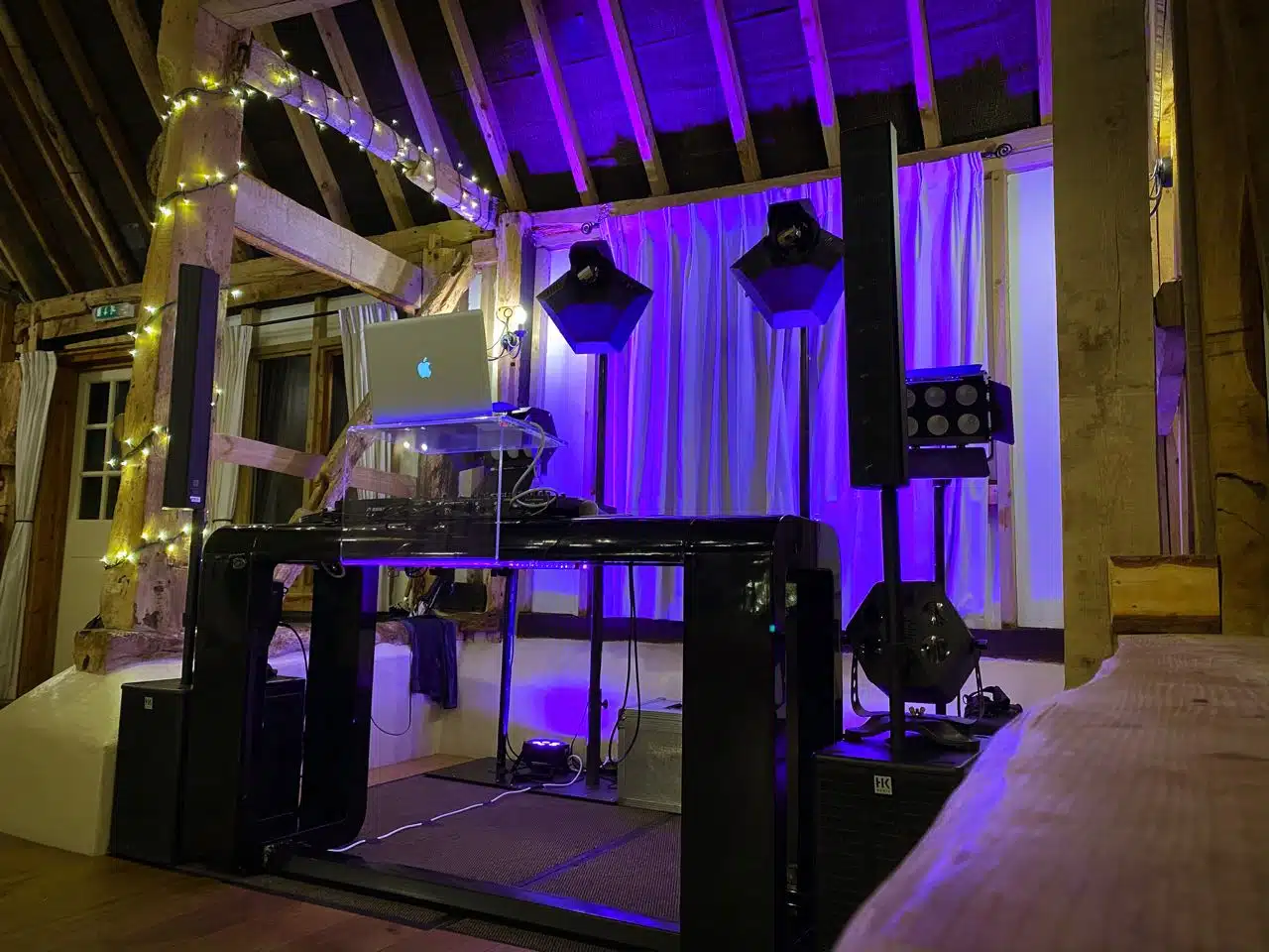 Clock Barn provides its own PA system for ceremonies, background music and speeches earlier in the day. Many couples choose to book me for the full day so I can provide music for the ceremony, manage the drinks reception and wedding breakfast music, and then continue into the evening reception.